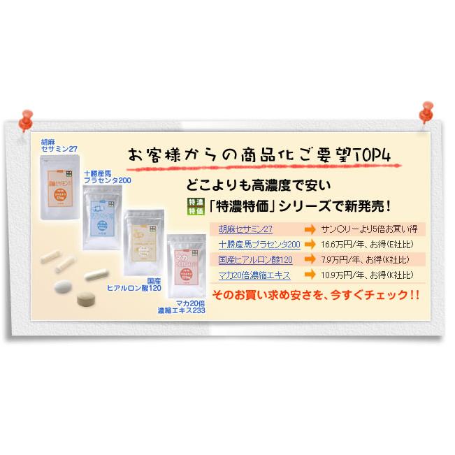 ウーロン茶で有名なサ●トリーさんのCMでも皆さまお馴染みの「セサミン」や、多くの女性に人気の「プラセンタ」、「ヒアルロン酸」、男女共に大人気の「マカ」と、お得意さまのご要望で多かった4商品が、どこよりも濃くて安い「特濃特価」シリーズで新発売。