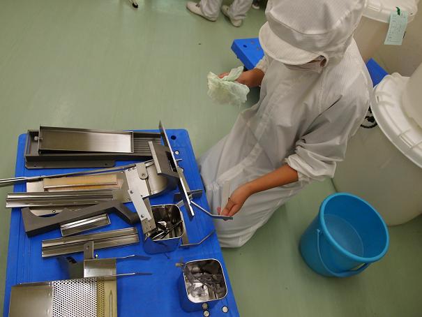 異物混入を防ぐため1つの製品を製造する毎に分解洗浄、、、これが細かくて大変な作業でして、間違いない作業をそつなくこなす技術者には本当に頭が下がります^^