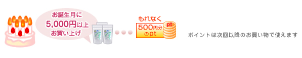 お誕生月に5,000円以上お買いあげのお客様へもれなく500円分のポイントをプレゼント!!