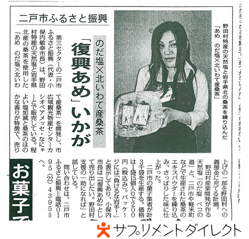 野田村産業開発が作る天然塩「のだ塩 ベコの道」と、二戸市や軽米町などで生産された桑茶のエキスパウダーを練り込み、さっぱりした味に仕上がった復興あめは二戸駅に隣接するなにゃーと物産センターにて販売中です。そして、6月1日水曜日 サプリメントダイレクトにて販売を開始いたします!!パッケージには「負けるな岩手!」と表示してあり小保内市長は「『復興あめ』として売り出し野田村支援の一助になれば」お話されているそうです。