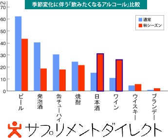 普段飲んでいる「ビール」「発泡酒」から、秋になると「日本酒」「ワイン」へ