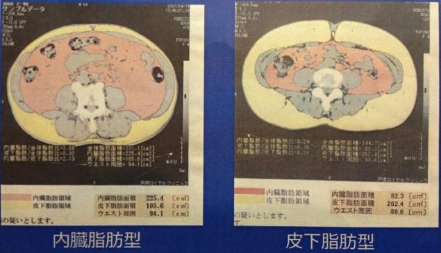 男性は内臓脂肪型が多く、女性は皮下脂肪型が多い。内臓脂肪型の方が健康上良くないとのこと。