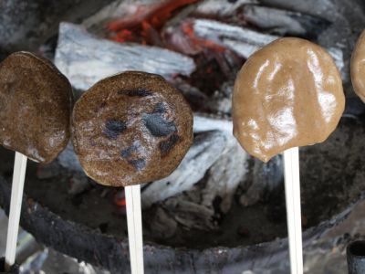 (他に味噌+砂糖・くるみ味噌などもあります)炭火で焼く「くしもち」