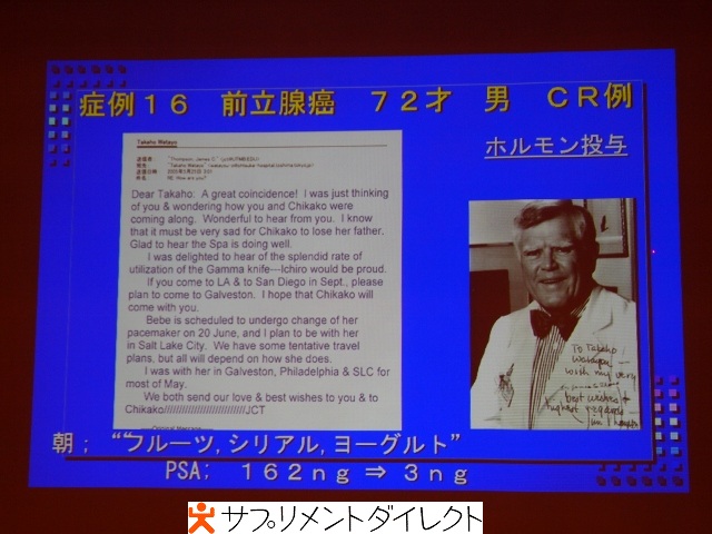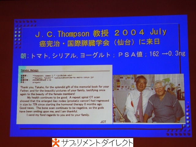 なんと晩年に前立腺癌になってしまい弟子であるワタヨウ先生が食事指導を始めていたことを知って、相談メールが来たそうです。ワタヨウ先生は、甲田先生に相談し果物、玄米、豆腐、を大量摂取してとトンプソン先生に伝えたそうですが、アメリカでは無理だ。と言われ、玄米→シリアル、豆腐→ヨーグルトで代用したそうです。