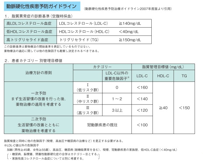ガイドラインによれば、血液検査の結果、高脂血症と診断されたら脂質の数値をどこまで低くすればよいか「管理目標値」を設定され治療が開始されます。