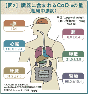 数年前に空前のブームになったのでご存知の方も多いCoQ10は、ビタミンのような栄養成分で、どんな動植物にも含まれている物質。人間の身体には、心臓、腎臓、肝臓や、筋肉といったエネルギーを非常に多く使う臓器や組織に多く存在しています。