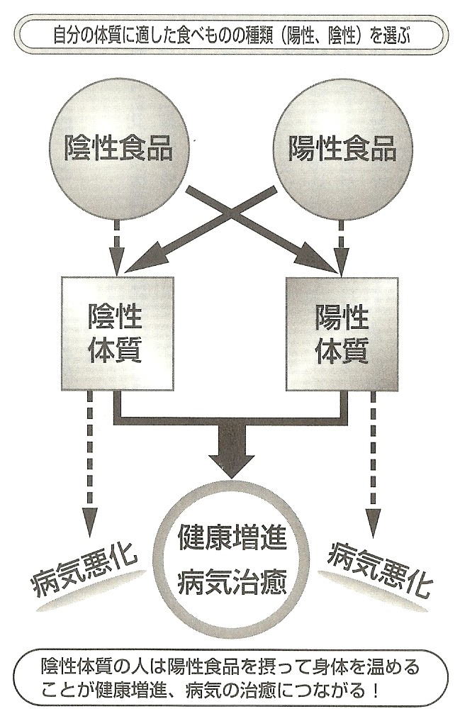 その地元で取れた食材を食べることが地産地消ですが、暑い地方や時期に採れた食材は体を冷やし、寒い地方や時期に採れた食材は体を温めると言われます。東洋医学には、万物は「陰と陽」の性質に分かれるという考え方があって、その流れを汲んで食品も「陰性」「陽性」に分けられています。