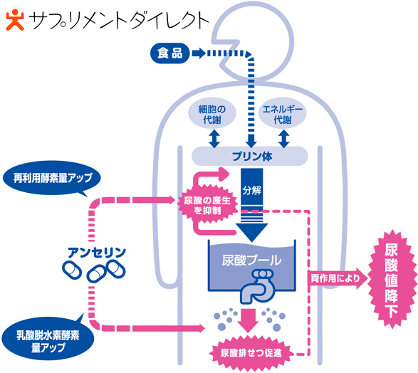 アンセリンは、尿酸が作られすぎることを抑え、作られすぎてしまった尿酸の体外への排泄を促進し、酸値を下げる働きをします。