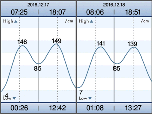 満潮:07:25 / 18:07 干潮:00:26 / 12:42日出 / 日入 06:41 / 16:30 00 < -4 01 > +8 02 >>>> +33 03 >>>>>>> +66 04 >>>>>>>>>> +99 05 >>>>>>>>>>>>> +126 06 >>>>>>>>>>>>>>> +142 07 >>>>>>>>>>>>>>> +146 08 >>>>>>>>>>>>>> +137 09 >>>>>>>>>>>>> +121 10 >>>>>>>>>>> +104 11 >>>>>>>>> +90 12 >>>>>>>>> +85 13 >>>>>>>>> +90 14 >>>>>>>>>>> +103 15 >>>>>>>>>>>> +120 16 >>>>>>>>>>>>>> +137 17 >>>>>>>>>>>>>>> +148 18 >>>>>>>>>>>>>>> +149 19 >>>>>>>>>>>>>> +134 20 >>>>>>>>>>> +110 21 >>>>>>>> +79 22 >>>>> +48 23 >>> +22