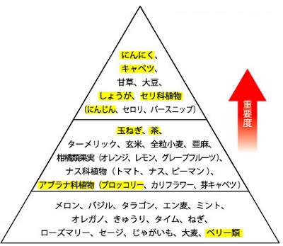 デザイナーフーズ・ピラミッドは1990年にアメリカ国立がん協会が発表した、食べ物の研究をまとめたもの。有効性のあると考えられる40種類の食品がピラミッドの3つのランクに分けられ、上段にいくほど効果が高いとされています。
